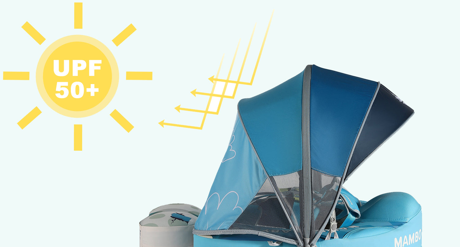 HECCEI Mambobaby Baby Swim Float comes with a removable canopy. The removable assemble UV-PROOF canopy sun canopy covered with UPF 50+ sunscreen coating protects baby’s skin away from the sun. Make baby enjoy the swimming fun in summer.