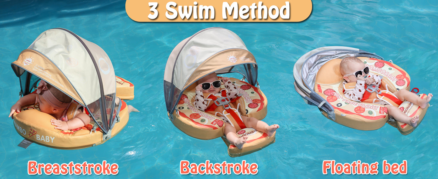 Add removable tail, Prevent baby from flipping backward. Upgraded safety buckle, The Upgraded safety buckle provides 5 support points and perfect 40¡ãangle to keep a balance to avoid baby flip over and fall off. Upgraded into 2 swim ways which are backstroke and breaststroke with different buckle method. Backstroke Suitable for 3~6months baby, breaststroke Suitable for 3~24months baby.