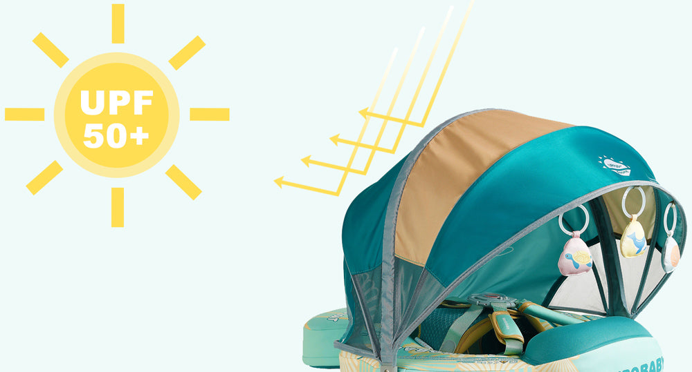 HECCEI Mambobaby Baby Swim Float comes with a removable canopy. The removable assemble UV-PROOF canopy sun canopy covered with UPF 50+ sunscreen coating protects baby’s skin away from the sun. Make baby enjoy the swimming fun in summer.